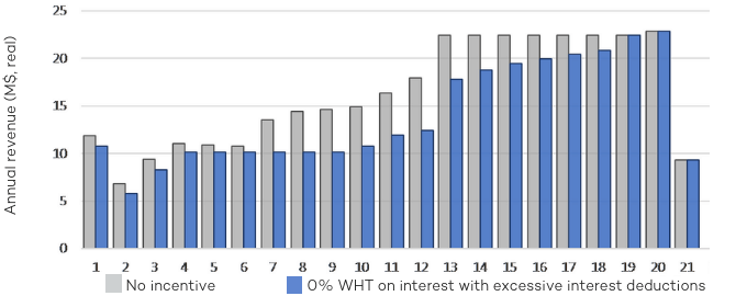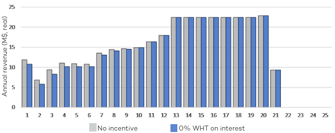 In general, governments impose tax on interest payments (referred to as withholding tax). If they offer a lower rate, it follows that they collect less tax. This scenario is shown in Figure 1, where the rate of tax is reduced from 15 per cent to zero. The figure was produced by the IGF Financial Model, an open source financial model that can be used by governments to estimate the cost of tax incentives. Under this scenario the government forgoes $6.4 million in revenue.
