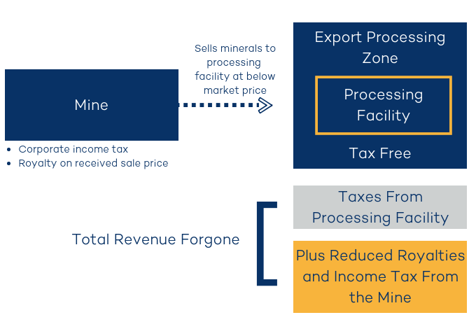Another way that governments may lose mining revenues is through underpricing of mineral sales. As an example, if a related party smelter is set up in an export processing zone (EPZ) that offers partial or reduced tax rates, there is an incentive for the mine, which is subject to normal tax rates, to deliberately underprice its minerals to reduce its taxable income and shift profits to the smelter in the EPZ.